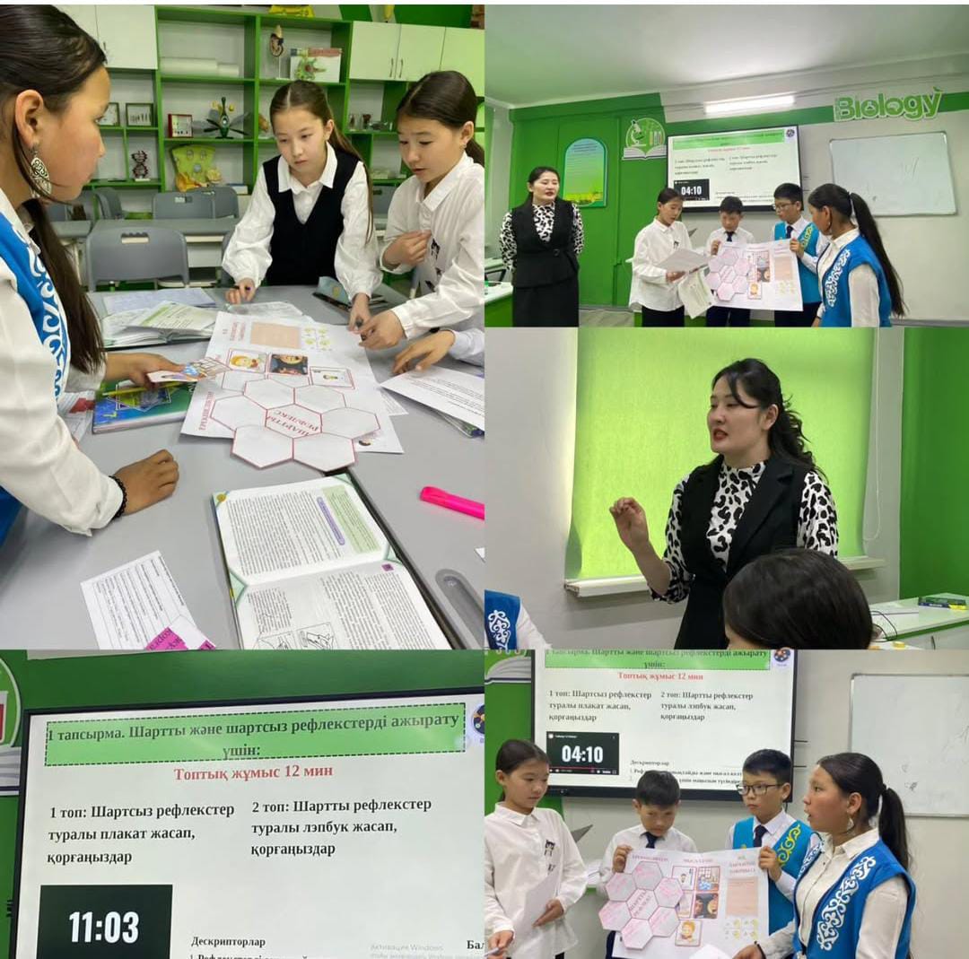 Оқушылар шартты және шартсыз рефлекстердің маңызын түсініп, адамның мінез-құлқындағы рөлін зерттеді. Тәжірибелік тапсырмалар мен белсенді талқылаулар сабақты ерекше әсерлі етті!