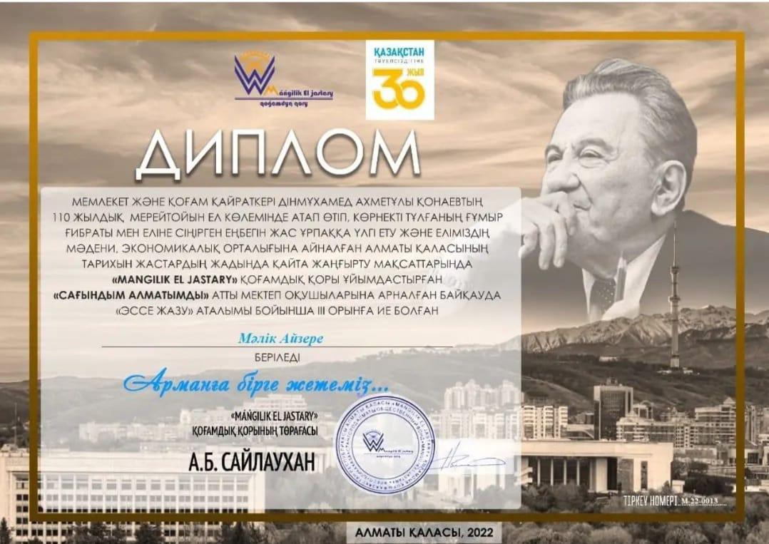 Жетісу облысы Кербұлақ ауданы Сарыөзек орта мектебі » Біз туралы » Жетістіктеріміз » Мемлекеттік және қоғам қайраткері Дінмұхамед Ахметұлы Қонаевтың 110 жылдық мерейтойын ел көлемінде атап өтіп, көрнекті тұлғаның ғұмыр ғибраты мен еліне сіңірген еңбегін жас ұрпаққа үлгі ету және еліміздің мәдени, экономикалық орталығына айналған