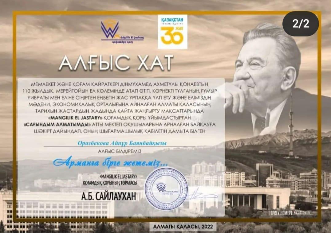 Мемлекеттік және қоғам қайраткері Дінмұхамед Ахметұлы Қонаевтың 110 жылдық мерейтойын ел көлемінде атап өтіп, көрнекті тұлғаның ғұмыр ғибраты мен еліне сіңірген еңбегін жас ұрпаққа үлгі ету және еліміздің мәдени, экономикалық орталығына айналған » Жетісу облысы Кербұлақ ауданы Сарыөзек орта мектебі