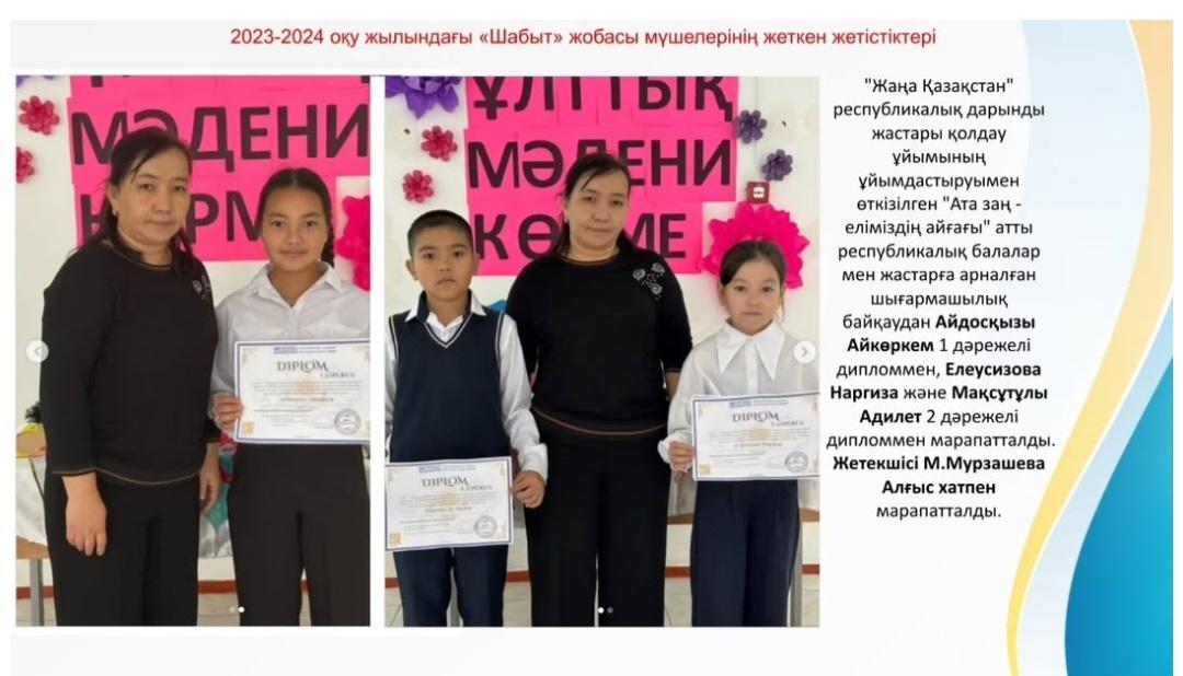 Жоба шеңберінде мектеп оқушыларының шығармашылық, зияткерлік және рухани дамуын қамтамасыз етуге бағытталған іс-шаралар өткізілді. Осы уақытқа дейінгі нәтижелер:
