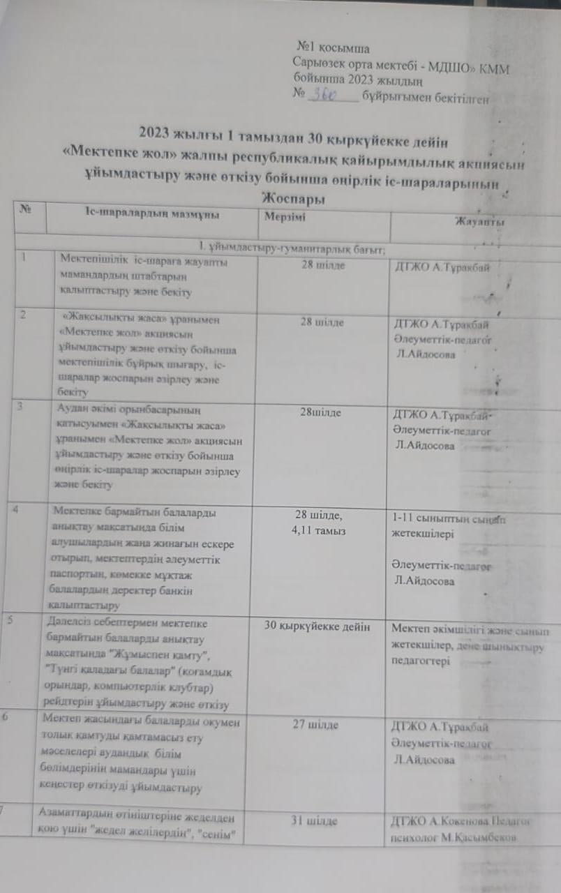 Мектепке жол акциясының бұйрығы » Жетісу облысы Кербұлақ ауданы Сарыөзек орта мектебі